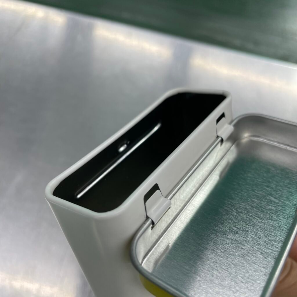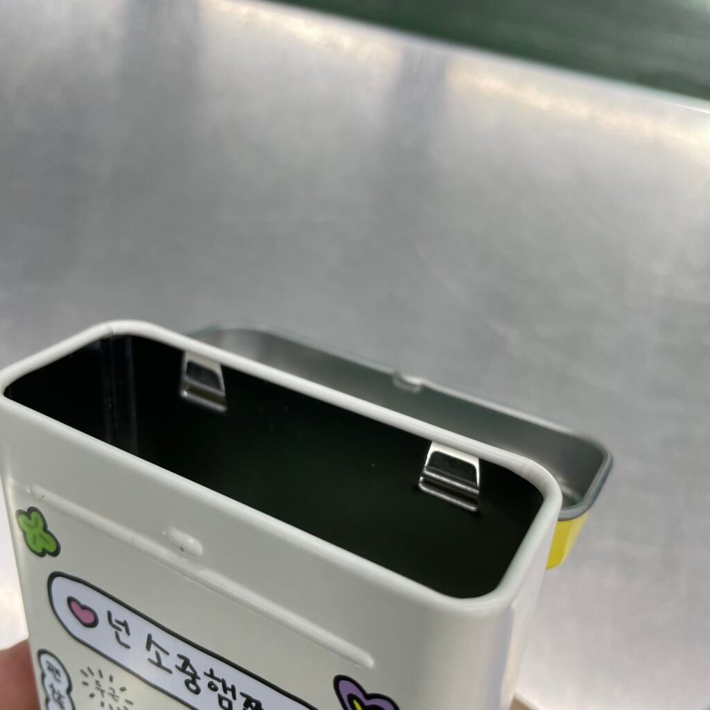 Hinged-lid Tin cans are often known as “flip-top cans”. The hinge is a mechanical device used to connect the box body and the lid and allow rotation between the two. The hinge assembly of the tin box may consist of a movable assembly or a foldable material. These types of tin boxes are sometimes reused to store items or to create kits, such as survival kit. A hobby involves modifying tin boxes with decorations and embellishments.