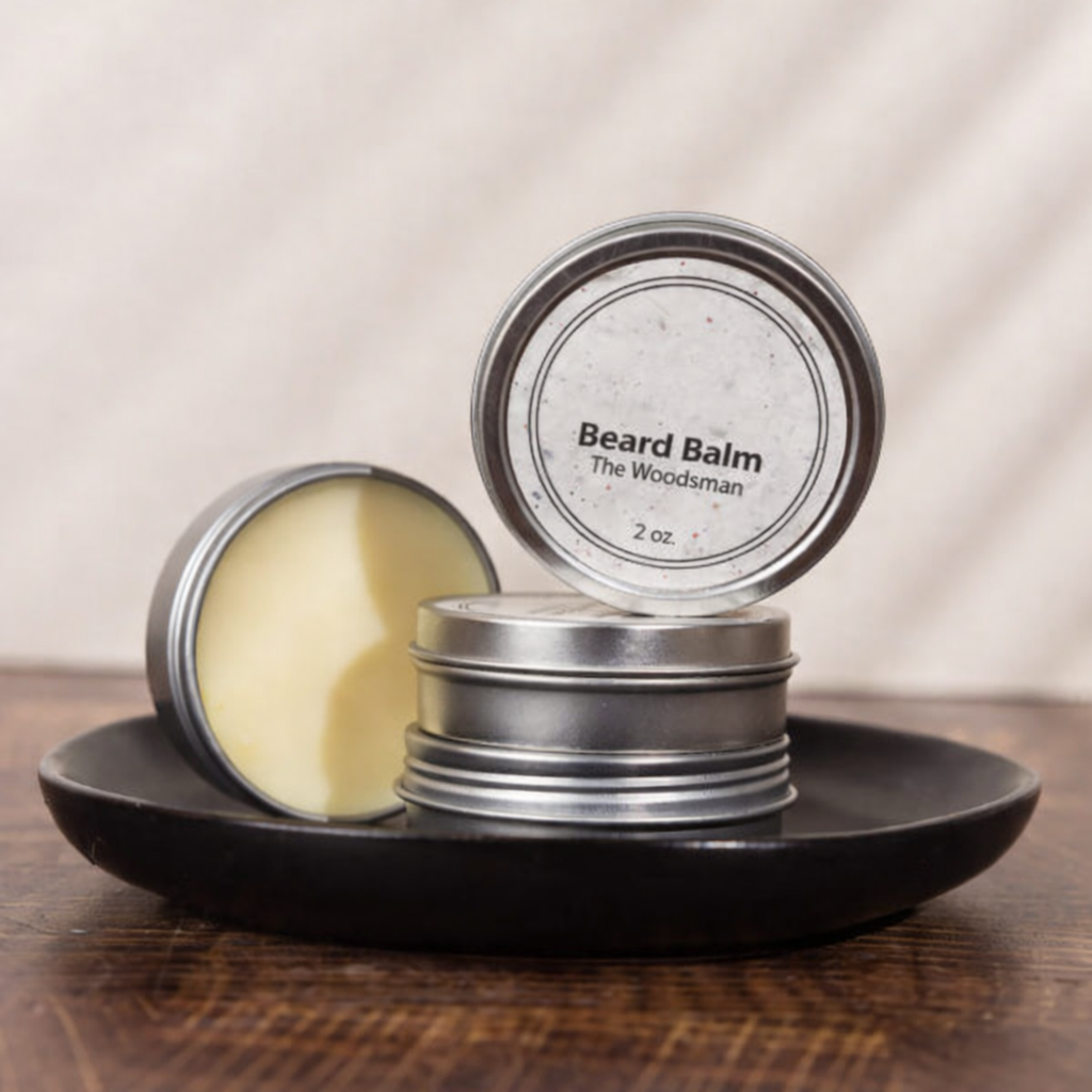 Beard balm tins are small metal tin containers specially designed to hold and package beard balm, a grooming product made from oils, waxes, and butters used to condition and style facial hair.
