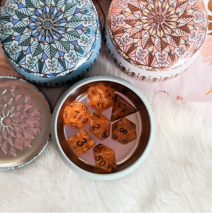 After the original dice are removed, it can become a mini organizer, travel case or DIY project box. The tin box can also store: extra dice sets, game tokens, miniatures, or small cards, other hobby accessories. The tin itself has a lot of value because it’s sturdy, compact, and reusable.