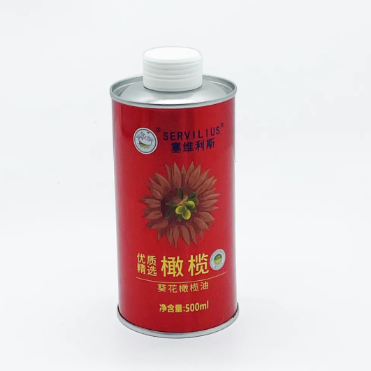 custom oil tin round Can, 500 mL (Dia75xH143mm), plastic cap, food Grade coating, CMYK Printing