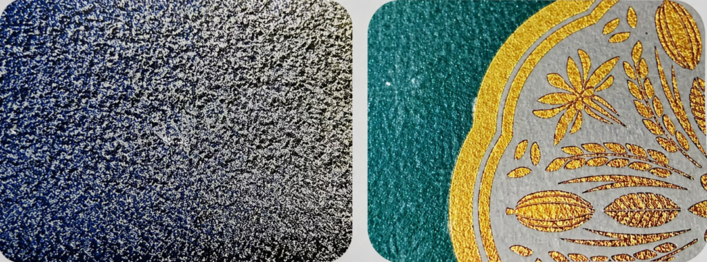 The surface is sparkling, with distinct and well-defined layers, featuring a smooth and pleasant tactile sensation. It’s highly eye-catching and adds a stronger sense of three-dimensionality. This effect is applied to high-end tea cans, cookie boxes and so on. The glossy or matte finish and texture density can be adjusted to meet customer requirements.