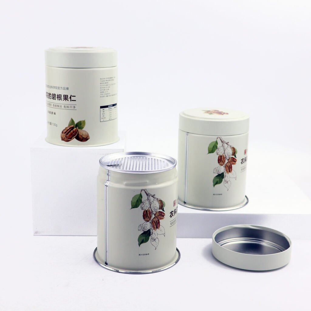 The base color of these tin cans is silver. The surface is finished with custom CMYK printing. The top lid is detachable and features a double lid- external lid and inside plug lid. They can be fully customized according to your wishes, including color, logo, embossing and pattern printing to create your completely customized metal can.